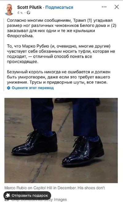 Трамп дарит своим холуям туфли, больше размером, и они их носят, чтобы его не обидеть. Все сказки про сумасшедших королей-самодуров были слишком добрые.