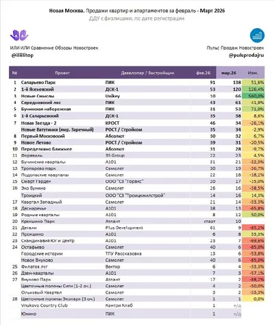 🔥 Ловите стату продаж Марта 2026 по всем новостройкам Москвы (старой) Сравнили с февралём, вместе с Пульсом Продаж Новостроек 🤝 ▪️#топжк Март 2026 ▫️Сберсити – стали №1. На волне вычерпанного спр