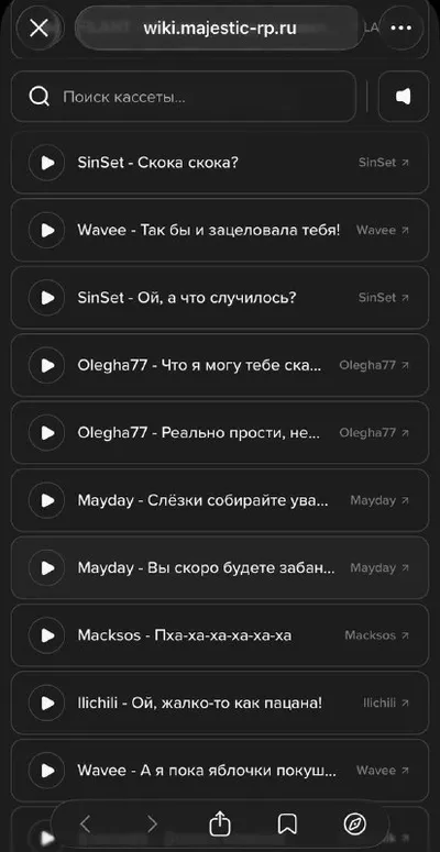 ❗️На Majestic Wiki появилась маленькая приятная функция - можно послушать все кассеты с фразами из пропусков https://wiki.majestic-rp.ru/ru/cassettes