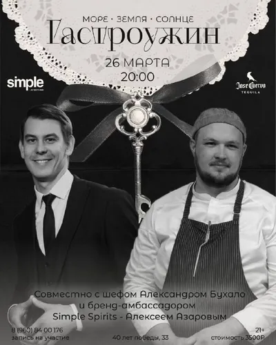 ГАСТРОУЖИН. МОРЕ - ЗЕМЛЯ - СОЛНЦЕ. Каждое блюдо, в исполнении шеф-повара - АЛЕКСАНДРА БУХАЛО. Каждый коктейль, персональный штрих от бренд амбассадора Simple Spirits - АЛЕКСЕЯ АЗАРОВА. 🌟 Велком-зак