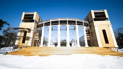Обшивка каркаса арт-объекта «Летний театр» ведется в парке Малаховки В п. Малаховка г.о. Люберцы в рамках госпрограммы Московской области «Формирование современной городской среды» национального прое