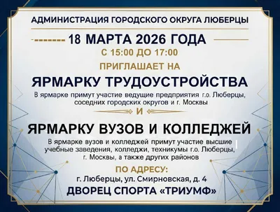 Ярмарка трудоустройства состоится в Люберцах 18 марта В среду, 18 марта, во Дворце спорта «Триумф» пройдет ярмарка трудоустройства, ее сможет посетить каждый желающий. Свои актуальные вакансии предл