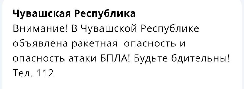 Внимание! Внимание! Ракетная опасность! На территории Республики Чувашия! Укройтесь в надёжном помещении — подвал или внутренняя комната без окон. Не пользуйтесь лифтом, отойдите от окон. Если вы на