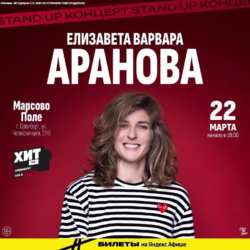 🎙️Розыгрыш 6 билетов для наших подписчиков! Елизавета Варвара Аранова — стендап-комикесса, сценарист и режиссёр, постоянный резидент шоу «Женский стендап» на ТНТ, ведущая подкаста «Страхи» и психоло
