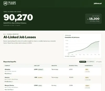 Заглянул на jobloss.ai, сайт показывает сколько людей потеряли работу из-за ИИ За год 90 тысяч человек. Основной удар пришелся на США - 76% сокращений. Больше всего аналоговых артефактов заменили в A