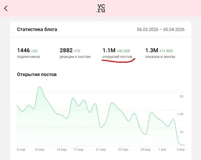 Набрал миллион открытий на VC.ru Я выкладываю статьи на площадке больше года: подборки, гайды, интервью, разборы проектов. Более ста публикаций на тему ИИ. Я хотел набрать подписчиков в телеграм-кана