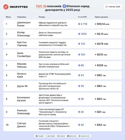 Сотрудник ТЦК возглавил рейтинг держателей Ethereum среди чиновников В декларациях за 2025 год чиновники суммарно указали 7151 ETH. Первое место занял офицер отделения гражданско-военного сотрудниче