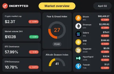 GM! - BTC ≈$66 400 (-2.48%) - ETH ≈$2 050 (-2.69%) - SOL ≈$80 (-5.25%) - Капитализация рынка ≈$2.3T (-2.59%) - Индекс страха и жадности: 27 (страх) - Индекс альтсезона: 41 Детальнее в инфографике.