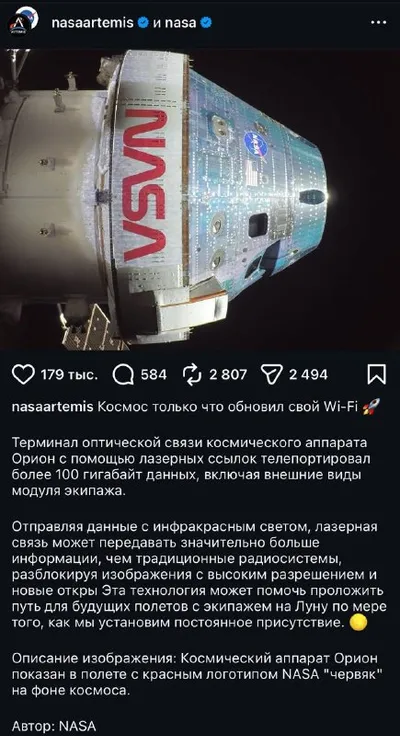 NASA теперь отправляет фотки с помощью ЛАЗЕРНОЙ связи — это ускорило передачу в 25 раз. Экипаж «Артемида-2» может присылать 4K-видео и другие данные со скоростью до 260 Мбит/с. Для сравнения: раньше