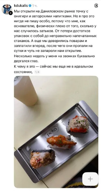 Ксюша Дукалис поделилась, как на Даниловском рынке открывали корнер (Река)²! Есть классная команда (у меня работают ребята с именами ЛАЙМ и МЕССИ, оба топовые), нам пришла часть тары, онигири стабил