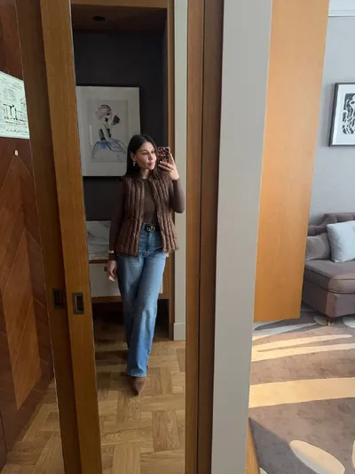 Надеваю тонкий пуховой жилет по фигуре: под пальто и в помещении. Вещь не базовая, но весной и осенью выручает 🤎 - Жилетка All we need - Боди LIME - Джинсы Gloria Jeans - Ботильоны Shop to Shop А в