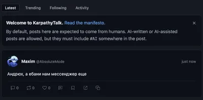 Андрей Карпаты навайбкодил свой собственный Твиттер для разработчиков. Только для живых людей. https://karpathytalk.com Оно и видно))