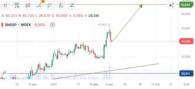 ⛽️ ПАО «Сургутнефтегаз» ап Тикер: #SNGSP Идея: Long Срок идеи: 3-4 недели Цель: 51,654 руб. Потенциал идеи: 14,27% Объем входа: 8% Стоп-приказ: 39,511 руб. Технический анализ Актив находится в устой