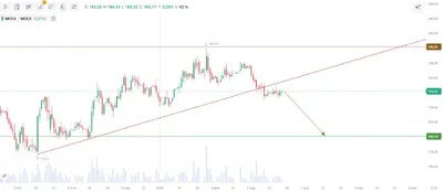 ПАО «Московская биржа» Тикер: #MOEX Идея: Short Срок идеи: 3-4 недели Цель: 160,24 руб. Потенциал идеи: 8,66% Объем входа: 8% Стоп-приказ: 190,5 руб. Технический анализ Пробитие поддержки восходящег