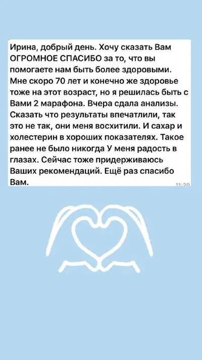 Это замечательный, тёплый и очень ценный отзыв! Моя участница не просто хвалит, а делится конкретным результатом (анализы), что является лучшим подтверждением эффективности моей работы.