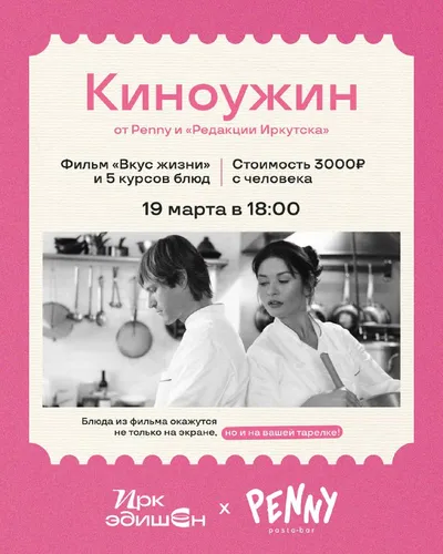 🍝 Киноужин Иркэдишен х Penny «Редакция Иркутска» и паста-бар Penny заколлабились, чтобы провести необычный для нашего города формат гастрономического киновечера! На большом экране мы будем смотреть