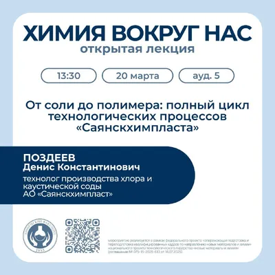 🧪 Химический факультет ИГУ приглашает всех желающих на открытую лекцию по теме «От соли до полимера: полный цикл технологических процессов "Саянскхимпласта"»👨🏫 🤩 Вы узнаете, как строятся совреме