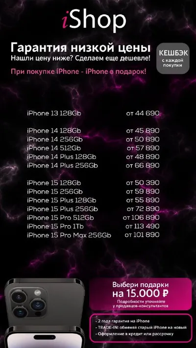 🔥 Почему технику в iShop покупать реально выгодно? Вот что действует сейчас 👇 📱Trade-in Сдаёшь старый телефон — получаешь скидку до 50 000 ₽ на новый. 🎂Минус 1 000 ₽ в день рождения Работает 3