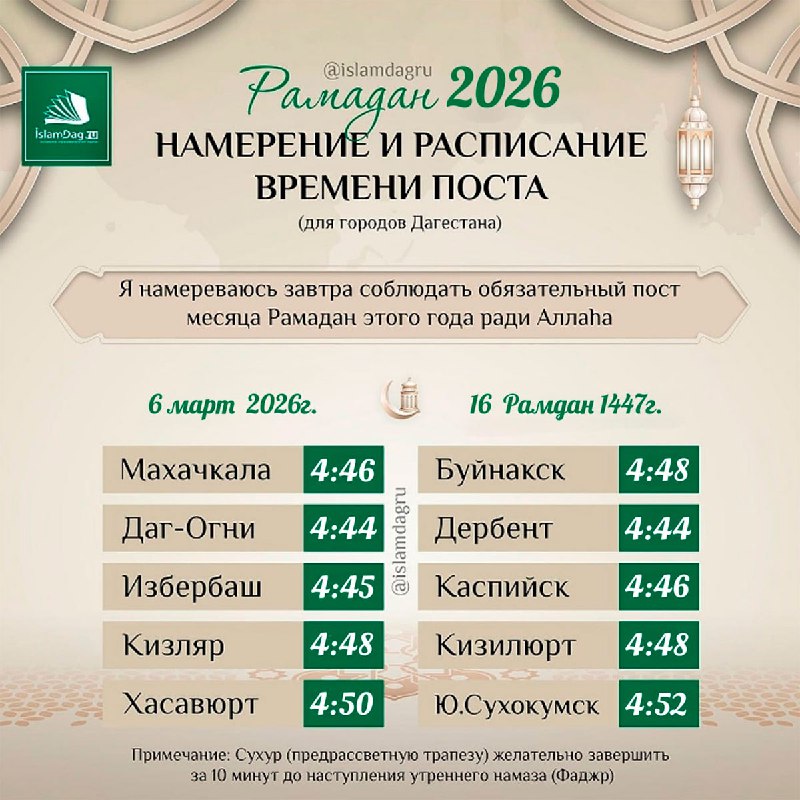 Дуа и расписание времени разговения (для городов Дагестана) 🤲 (О Аллаh, ради Тебя я постился и дарованным Тобой пропитанием разговелся) 🗓 6 март - 16 Рамадан