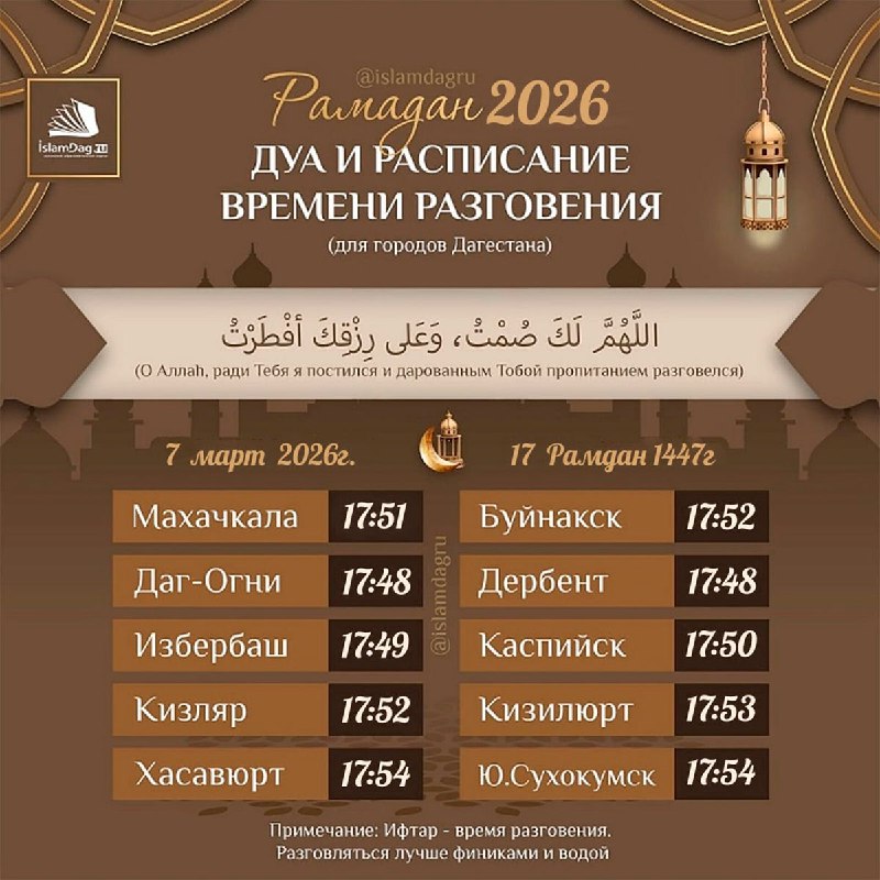 Дуа и расписание времени разговения (для городов Дагестана) 🤲 (О Аллаh, ради Тебя я постился и дарованным Тобой пропитанием разговелся) 🗓 7 март - 17 Рамадан