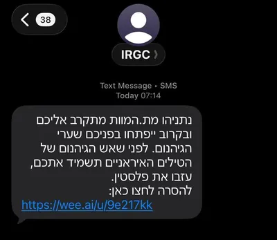 Вот такие sms рассылает Иран жителям Израиля. Перевод: «Нетаньяху мертв. Смерть приближается к вам, и скоро перед вами откроются врата ада. Прежде чем адский огонь иранских ракет уничтожит вас, поки