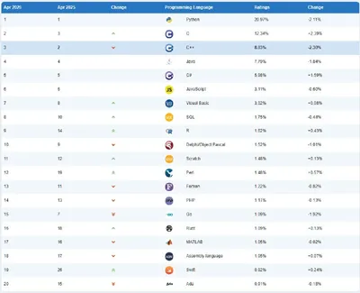 Python теряет отрыв TIOBE выпустили свой очередной рейтинг наиболее популярных языков программирования. На начало апреля 2026 года картина сложилась следующая: ⚡️ Python сохраняет свое лидерство, но