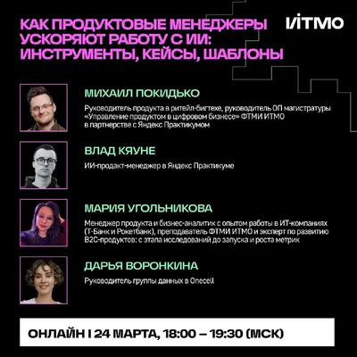 💻 Как продуктовые менеджеры ускоряют работу с ИИ? Расскажут эксперты Яндекс Практикума, Т-Банка, ИТМО, Onecell на вебинаре от Факультета технологического менеджмента и инноваций ИТМО! 😍 На встрече