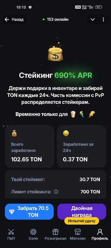Сыграл ставочку в PVP 🏳️Rolls Не фартануло,но я не отчаиваюсь,кручу разок в сутки ставочку 0,5 тон 🙂↕️Кстати APR в стейкинге почти 60%,он растет за счет комиссий с игр,а значит люди игра