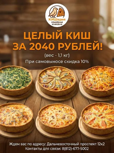 Киш с Курой и грибами (1,1кг)- 1860₽ Киш с индейкой (1,1кг) - 1860₽ Киш с семгой (семга, бракколи, сливки. молоко, яйца, тесто.) - 2040₽ Киш с морепродуктами ( креветка, кальмар, крабовые палочки,