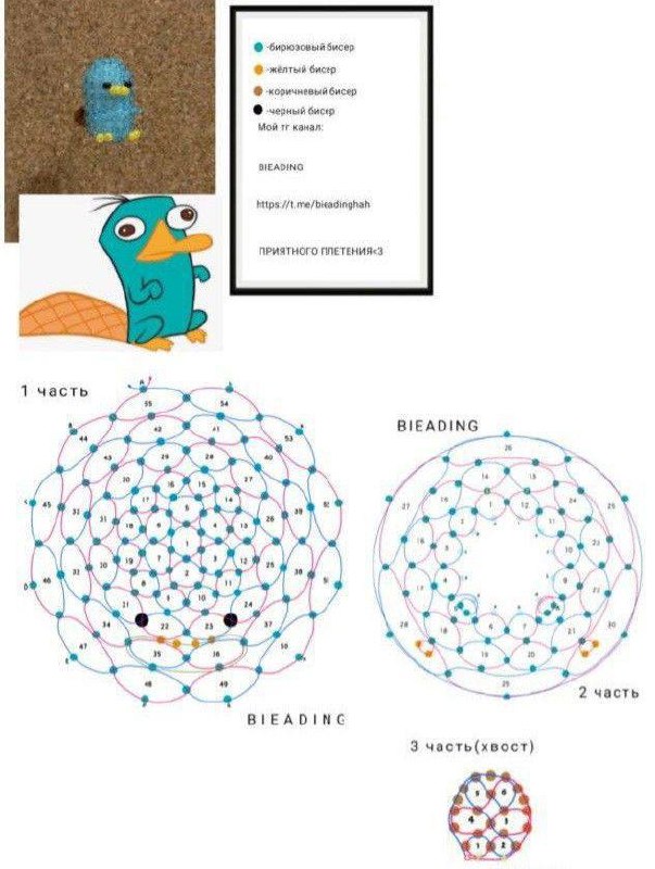 🌟Пэрри Утконос ~ Секретный агент и вообще милашка! 🎁 Тебе понадобится: 🔼голубой бисер 🔼оранжевый бисер 🔼коричневый бисер 🔼чёрный бисер для глаз 🔼леска 0,15–0,25 мм Идеи и схемы