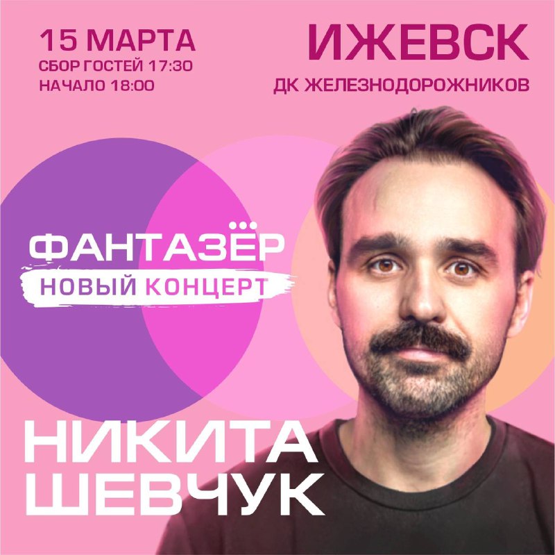 Ижевск ДК Железнодорожников 15 марта 2026г. 18:00 Standup Никита Шевчук "Фантазёр" Непредсказуемый, острый на язык и самобытный — Никита Шевчук с новой программой "Фантазер". Никита открывает двери