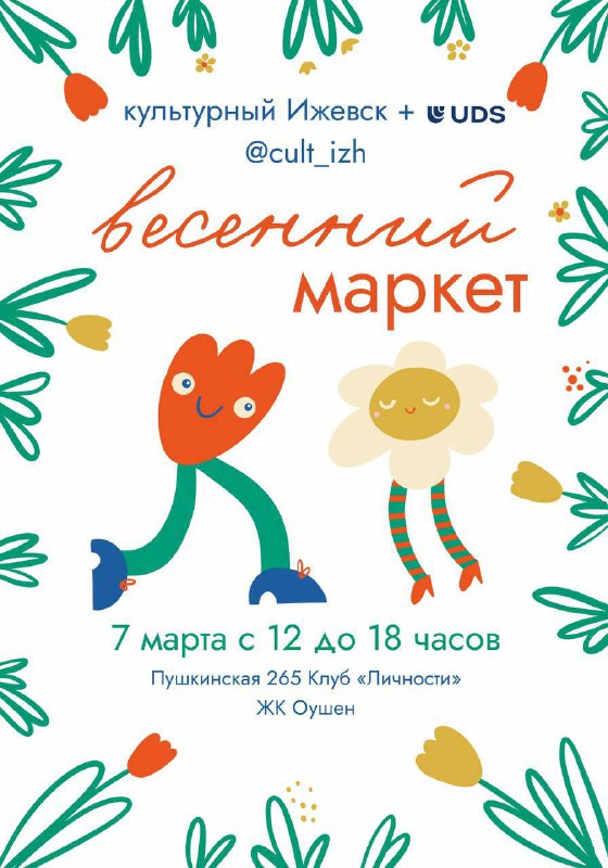 Весенний маркет от Культурного Ижевска 7 марта 🌸 ✨Маркет локальных брендов ✨Мастер-классы ✨Фотограф ✨Приятные встречи Вход свободный! Ждем вас на Пушкинской 265, Клуб «Личности», ЖК Оушен Сити с 1