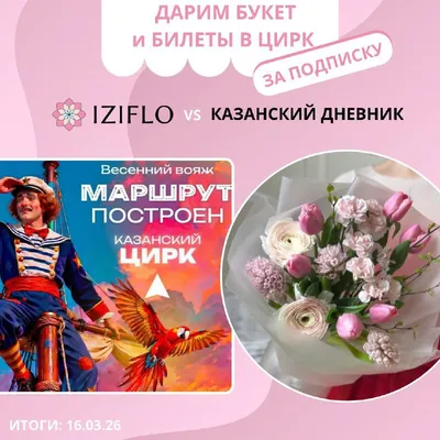 Казань! Дарим весенний букет и билеты в цирк✨ Цветочный салон IZIFLO и канал Казанский дневник разыграют свежий букет и 2 билета в Казанский цирк на представление «Маршрут построен»🎪 Условия участи
