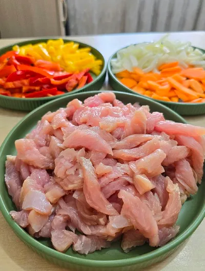 А что у вас сегодня вкусного? У нас сегодня быстрый и простой обед. ✅️Филе грудки индейки - 500 гр. ✅️Лук - 1 шт. ✅️Морковь - 1 шт. ✅️Болгарский перец красный - 1/2 шт. ✅️Болгарский перец жёлтый -
