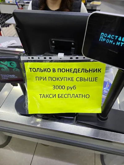 Я когда увидела рекламу по телевизору, думала, что я что-то неправильно поняла. А тут смотрю, на кассе повесили объявление. Это КОСКО. Я спросила каким образом они такси оплачивают. Сказали, что отвоз