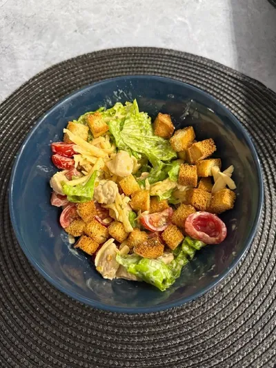 Добрый день, дорогие друзья! Всем ярких и плодотворных выходных! Супруг в отпуске, радует вкусными обедами и ужинами. Салат "Цезарь" в его исполнении. К слову супруг Дима очень хорошо готовит. Чему