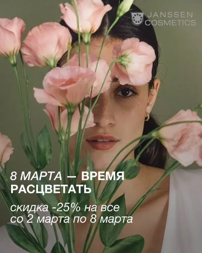 🤩 Акция к 8 Марта — 25% на всё* С 2 по 8 марта 2026 года действует специальное предложение: –25% на весь ассортимент Janssen Cosmetics Предложение распространяется на весь ассортимент сайта. *кром