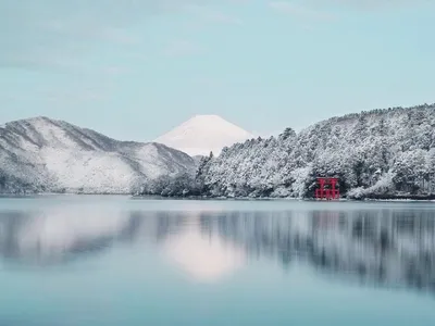 Укрытое снегом озеро Асиноко и близлежащий городок, префектура Канагава Т