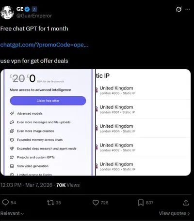 🔥🔥 Лутаем подписку ChatGPT на месяц БЕСПЛАТНО — гайд выкатил юзер Хвиттера Что для этого нужно: 1️⃣ Используя прогу из трех букв меняем свой регион — ставим Великобританию или Индию, на других не п