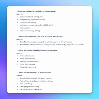 Вопросы для собеседования по микросервисам с ответами 1. Каковы ключевые характеристики микросервисов? Ответ: > Децентрализованное управление данными > Сервисы развёртываются независимо друг от дру