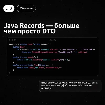 👩💻 Java Records — больше чем просто DTO Records часто используют только для хранения данных, но это полноценный тип с поддержкой бизнес-логики. Внутри можно описать валидацию, нормализацию, фабрич