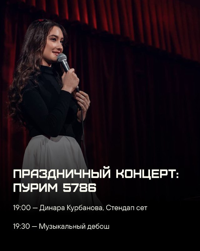 📌Праздничный концерт: Пурим 5786 🔜 8 марта 🟣19:00 — Динара Курбанова, Стендап сет Новая звезда в российском стендапе. За ее милым голосом и наивным образом скрываются бескомпромиссные шутки, кот
