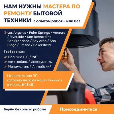 Вакансия: Мастер по ремонту бытовой техники 40-50% Нам нужны техники с опытом работы или без в следующих районах: - Los Angeles / Palm Springs / Ventura / Riverside / San Bernardino - San Francisco