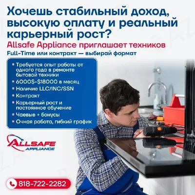 Построй карьеру в ремонте бытовой техники вместе с Allsafe Хочешь стабильный доход, высокую оплату и реальный карьерный рост? Allsafe Appliance приглашает мотивированных техников для построения долг