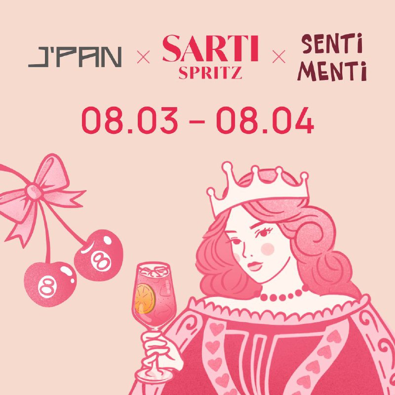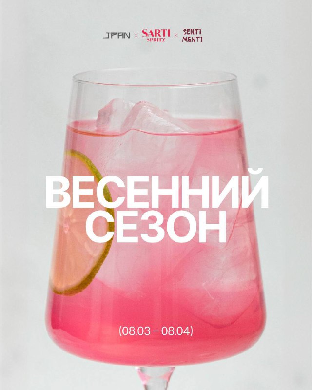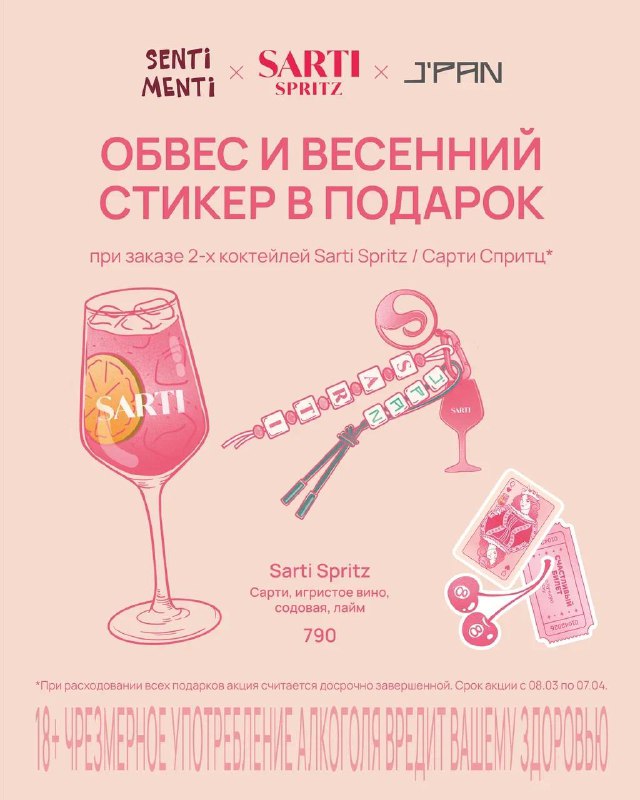 Весенний сезон J’PAN × SENTI MENTI × SARTI 🌸 Открываем весенний сезон и дарим подарки: 💞 При заказе двух коктейлей Сарти Спритц (850₽) в SENTI MENTI или J’PAN подготовили стильный стикер и брендир