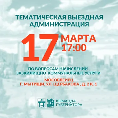 Уважаемые мытищинцы! 🚩 Приглашаю вас на тематическую встречу в формате «выездной администрации» по вопросам начислений за жилищно-коммунальные услуги, которая состоится 17 марта. Вы сможете адрес