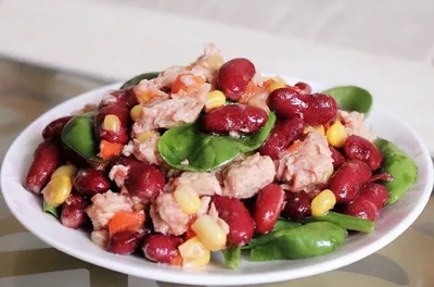 🥗САЛАТ С ТУНЦОМ И ФАСОЛЬЮ Рецепт Тунец консервированный в собственном соку 130 г Фасоль 50 г Морковь 100 г Кукуруза 100 г Оливковое масло 1 ст.л Листья салата 20 г (у меня шпинат) Чеснок 1 зб (можно