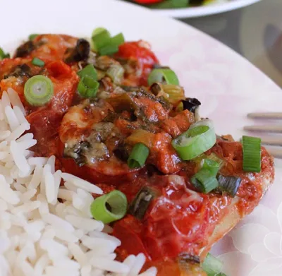 🐠ТРЕСКА В СЫРНО-ТОМАТНОМ СУФЛЕ Рецепт Филе трески 600 г (или другая рыба) Сметана 10% 80 г Томатная паста 80 г Помидоры 100 г Сыр 50 г Зелёный лук 30 г Противень застелить фольгой и выложить рыбу.