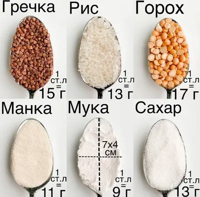 🥄ВЕС ПРОДУКТОВ В СТОЛОВЫХ ЛОЖКАХ* 🥄Ложка у меня стандартная 7х4 см Гречка 1 ст.л. 15 г Рис белый 1 ст.л. 13 г Горох 1 ст.л. 17 г Манка 1 ст.л. 11 г Мука 1 ст.л. 9-11 г Сахар 1 ст.л. 13 г *ложка