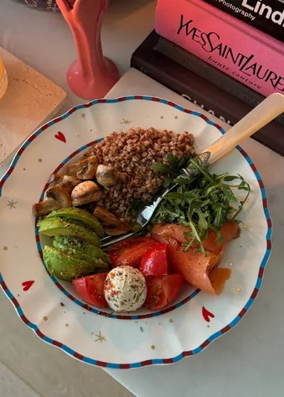 рубрика на домашнем 📷📷 🔴любимый обед с овощами и гречкой из тарелочки Bitossi 🩷 🔴лук дня, из которого не хочется вылезать: джемпер Cos, брюки voishe 🥲 🔴отличный рабочий тонер с небольшой кон